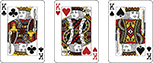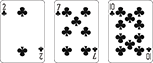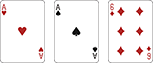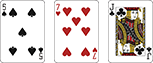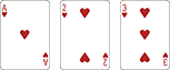 | Sảnh | Ba lá bài trong một chuỗi số liên tiếp nhưng không đồng chất | ![]() |
